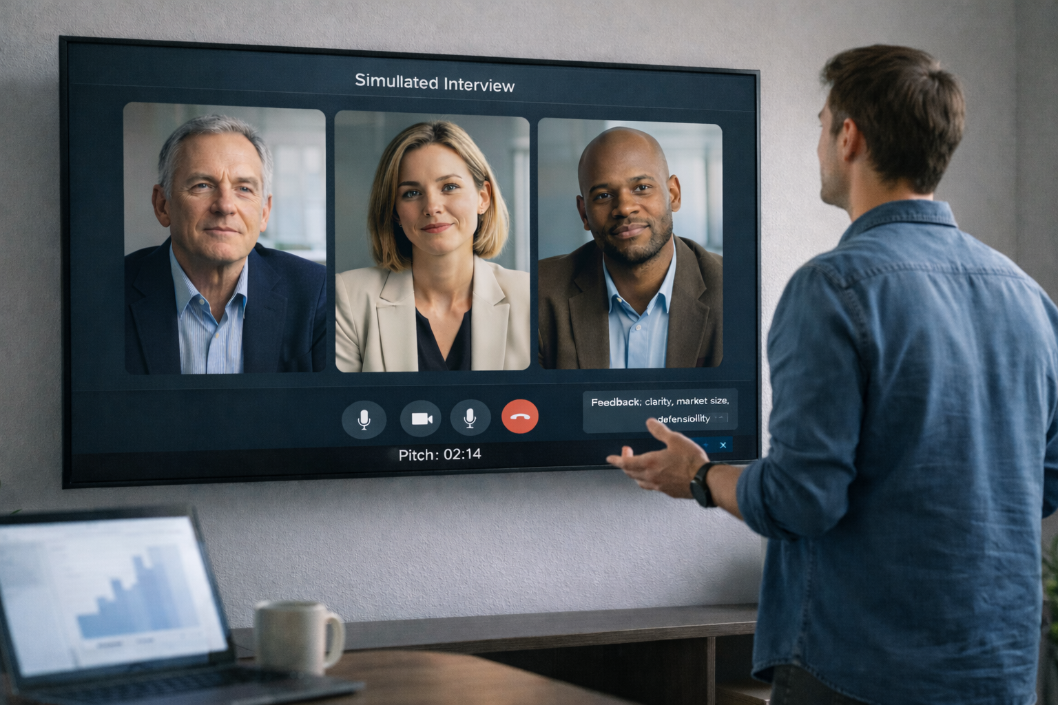 Founder practicing a pitch in front of a screen with three AI investor personas in a simulated interview.